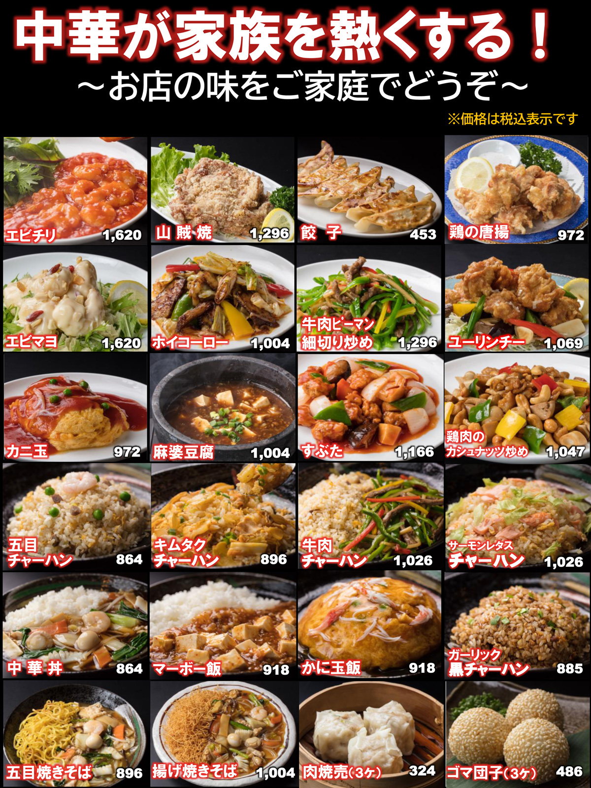本格中華をご家庭で! 受付電話 0263-52-2340 | 麺類・ご飯 | 海鮮・魚介 | 肉料理 | 野菜料理・豆腐料理 | 前菜・サラダ・酒肴 | 点心・スープ | お子様メニュー | テイクアウト |