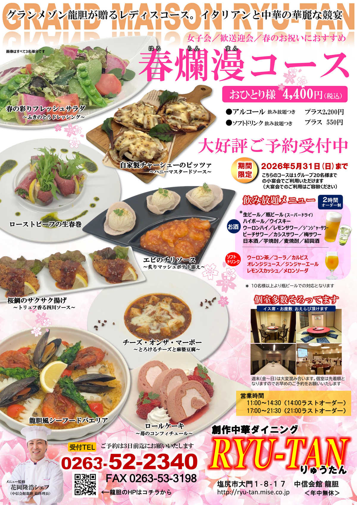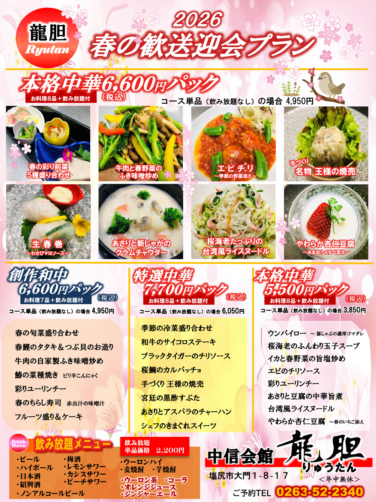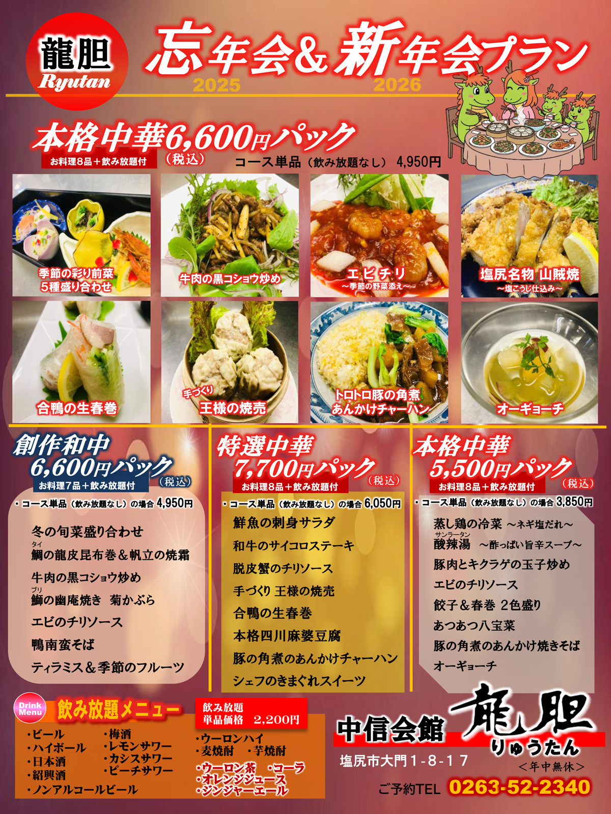 大小ご宴会 人数、ご予算、飲み放題などお客様のご要望にあわせたご宴席を設営させていただきます。 お気軽にご相談ください。 Ryu-Tanには様々なシーンに合わせてご対応させていただけるホールが併設されております。 お気軽にご相談ください。 ■季節の宴会コース ■ファミリーコース (お友達やご家族との少人数パーティー向け) ■小中学生と親子向けスタイル(謝恩会、卒団式など)